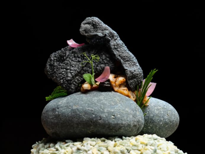 For Crocodile & Crackers, the short film of Long Kuan Hung Crocodile Farm feels like a farm “excursion” while crocodile tail meat is being charcoal-grilled in the restaurant. The meat is then dressed with herbs to give it a similar taste profile to a Thai larb salad before it is plated with charcoal rice crackers to resemble the rocky vegetation of the crocodile’s natural habitat.