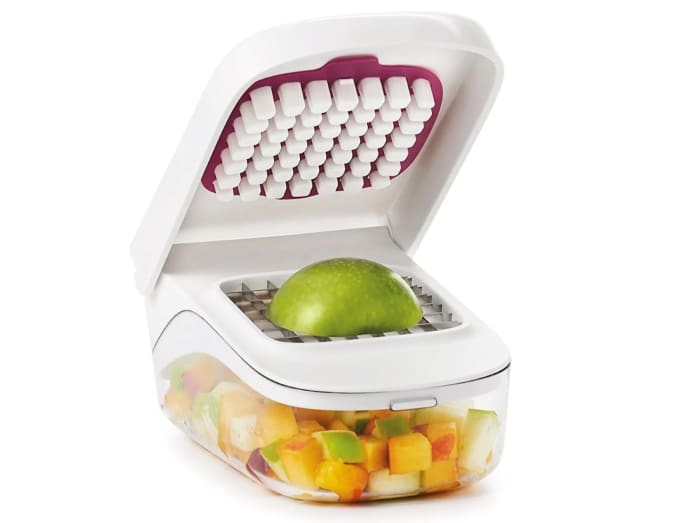 If the thought of chopping countless ingredients fills you with dread, you’ll thank us for this recommendation, which chops fruits and vegetables in one fell swoop. A grid of thin, stainless-steel blades produces consistently sized ingredients, which are collected in a container with a 2.5-cup capacity. Cleaning is a cinch with a removable grid that helps clean between the chopper blades, and it easily snaps back onto its non-slip base. Say goodbye to onion-induced tears and hello to effortless chopping.