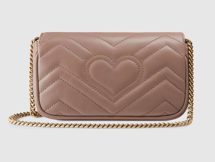 Released in 2016, the Marmont remains a coveted design thanks to the numerous iterations on this classic. The timeless soft silhouette is made elegant with chevron quilting and hardware – this version features a dusty pink hue paired with matte gold buckle. The matelasse leather super mini holds essentials like an iPhone, card case and lipstick. An internal key ring lets this connect to a larger bag, so you won’t need to transfer contents. Flip the bag over to reveal why this is particularly suited for Valentine's – the stitching forms a heart.