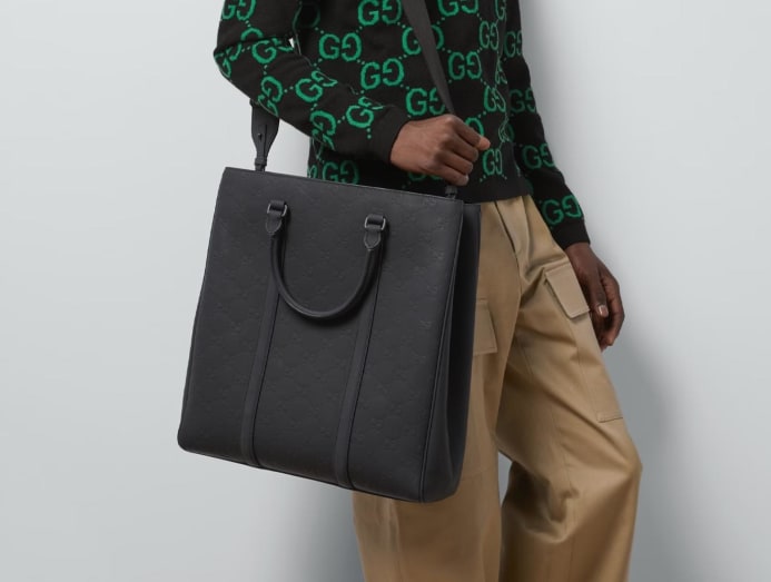 A tote bag is an extremely versatile piece that transitions beautifully between work and life, and this rendition offers an edgy flair. Injecting a dose of modernity with a new material, Gucci unveiled a collection of men's bags in an innovative black rubber-effect leather for Cruise 2024. This material infuses a sense of contemporary style into the timeless essential, and as its utilitarian nature goes, features two zip pockets with an open pocket nestled within. With the GG logo lightly branded into the leather, the effect is an understated piece that boasts both functionality and refinement.