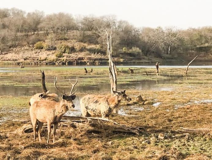 In between the tiger encounters, we spotted other native wildlife of the semi-dry deciduous forest, including a blue bull, an Indian hare, some more sambar deer, crocodiles, and a pair of mating lapwing birds.