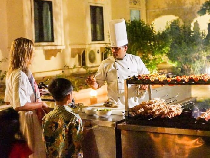 We spent the rest of the day in the turquoise pool of the exotic 175-year-old Samode Haveli hotel, grateful for the cool water as the sun barbecued our heads – and the bodies of a few pink Europeans, roasting themselves on sunbeds in 48 degree Celsius summer heat. Servers in pastel coloured salwar kameez floated by with lemon water, fresh towels and other amenities to enhance our poolside lounging.