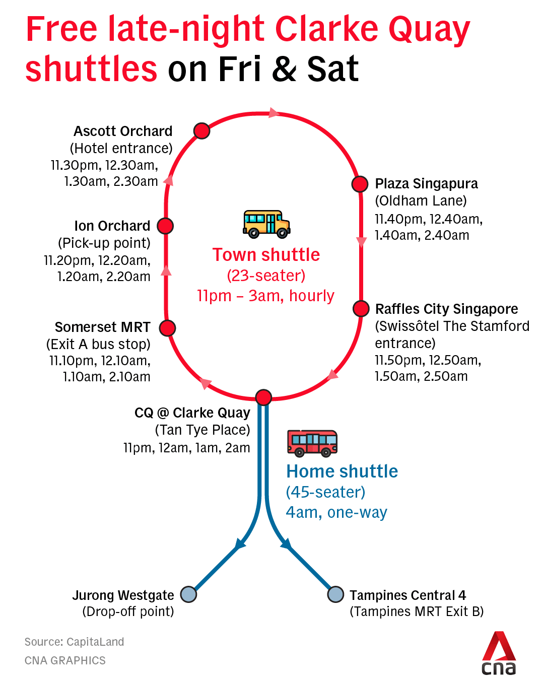 Free weekend late-night shuttle bus from Clarke Quay to 5 locations around town, plus rides to Tampines and Jurong