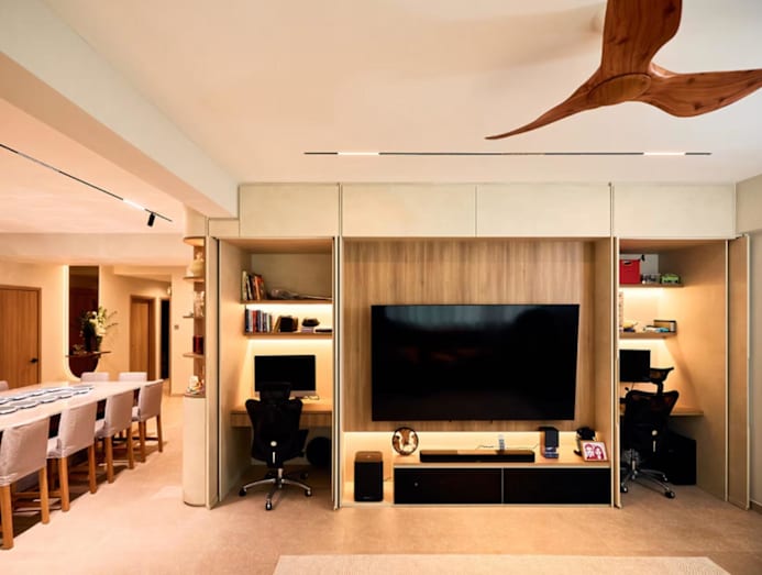 To make this work, their ID designed two hidden workstations that can be neatly tucked away when not in use. These give the kids a dedicated space to study or game without cluttering the shared space.