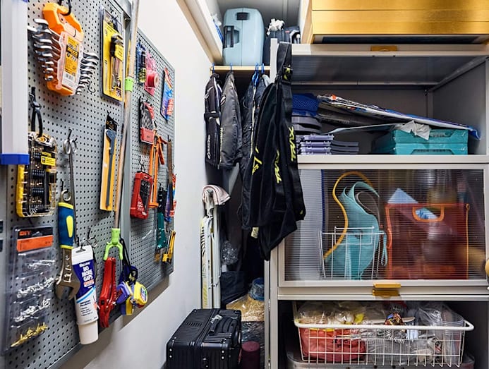So, a third of the living room was carved out for a storeroom aka Lim’s “man cave”. Hidden neatly behind the TV wall, it’s stacked with racks of biking and travel gear, and even a tool wall. Think of it as Lim’s “private hardware shop”, where he can admire his toys and tinker away.