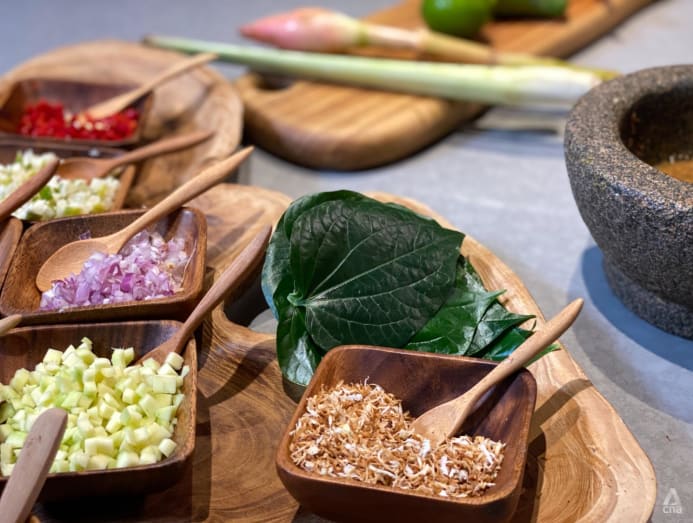 “Use wild pepper leaves as a base, and put a whole load of condiments in, such as chilli, lime, lemongrass, ginger, green mango, some shallots, peanuts, toasted coconut. Add in a sauce made from tamarind juice, gula melaka, salt. Then wrap it up into little parcels to eat,” she said, demonstrating how to do it.