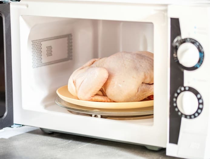 If your chicken or other food is too big, cut or chop it into smaller pieces. The more surface area you create in your food, the more efficient it’ll be for the microwaves to do their work, he added. “You might also want to place a cover over the food to contain the water.”