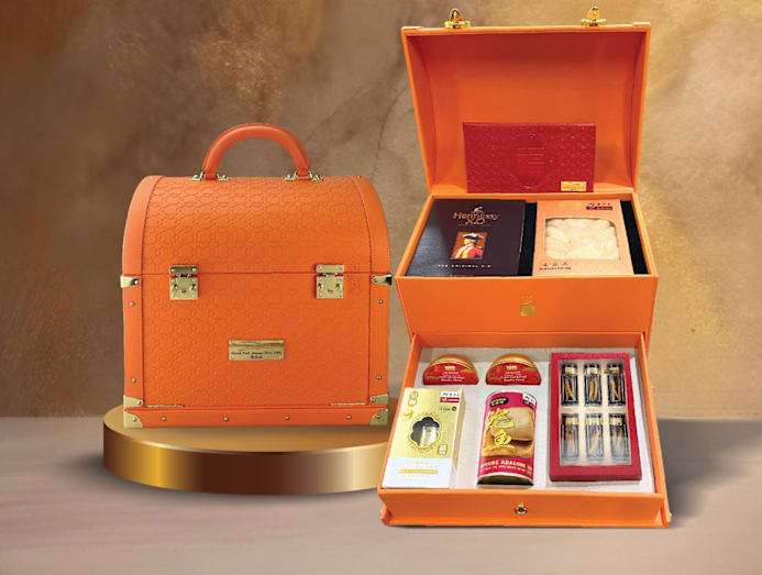 Inspired by vintage travel trunks, the Auspicious Harmony gift set features a bright orange chest, designed by Choo, filled with various items, including Hennessy XO cognac, assorted delicacies such as bird's nest and abalone, as well as a limited-edition hongbao holder.