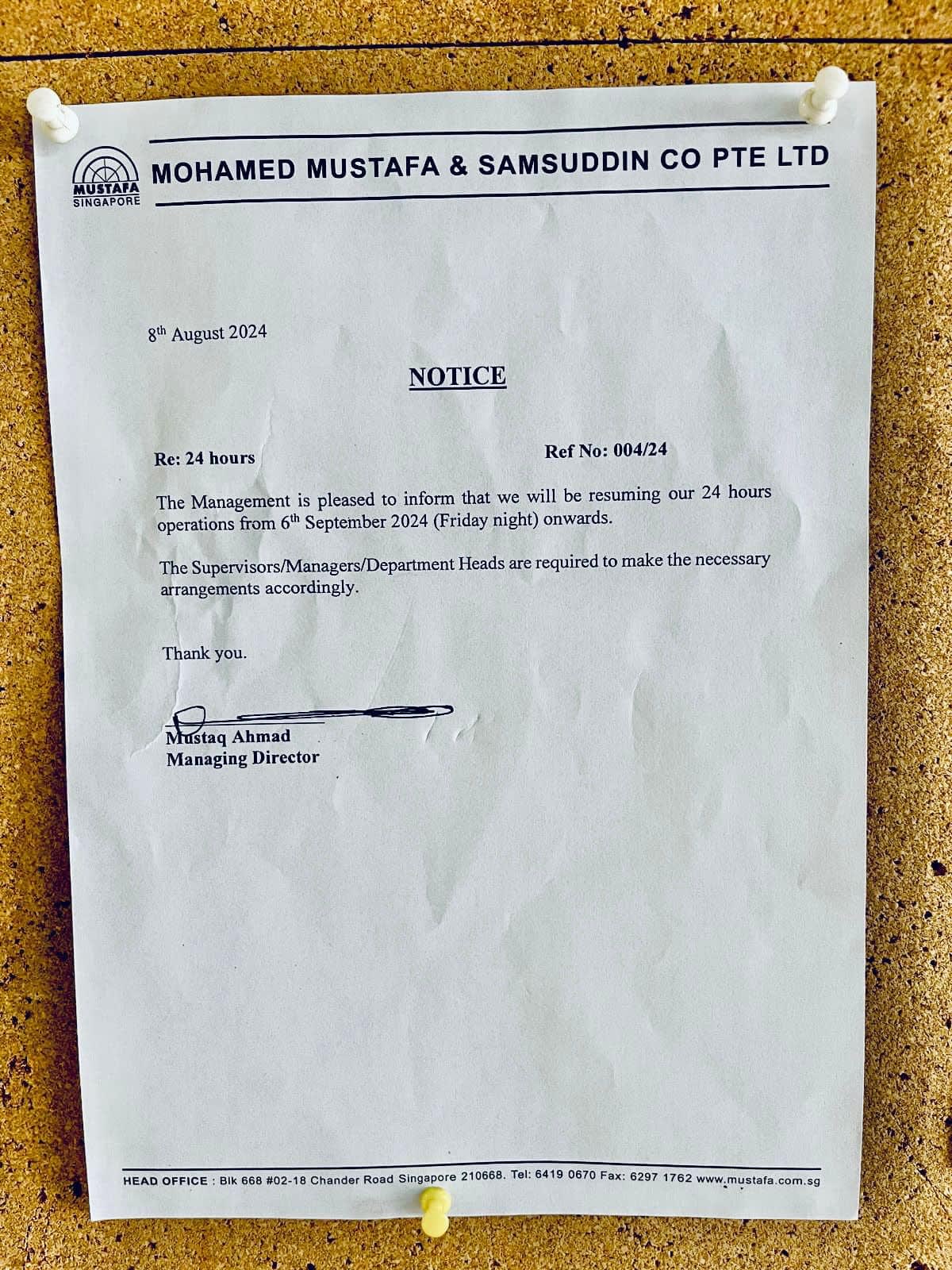 Netizens have shared photos of a notice printed on a Mohamed Mustafa & Samsudin Co Pte Ltd letterhead dated Aug 8 that states: “The Management is pleased to inform that we will be resuming our 24 hours operations from 6th September 2024 (Friday night) onwards.”
