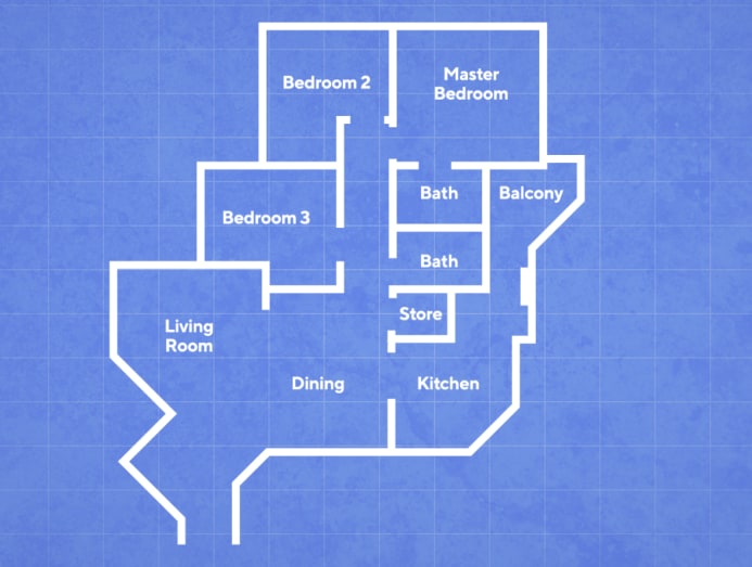 It begins with a trapezoidal entryway, which leads to a trapezoidal living and dining area. Two out of its three bedrooms were L-shaped, and the kitchen zig-zags its way to the funnel-shaped service yard beyond it.