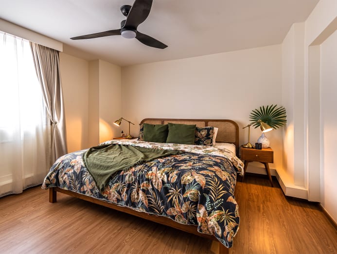 The flooring in the living and dining areas, kitchen and bedrooms was redone in vinyl resembling long wooden floorboards, in a warm teak hue. Walls were kept mostly white. Overhead, black ceiling fans and white track lights with orange-hued bulbs were installed throughout. Wooden blinds in the same colour as the flooring, were used as window treatments.