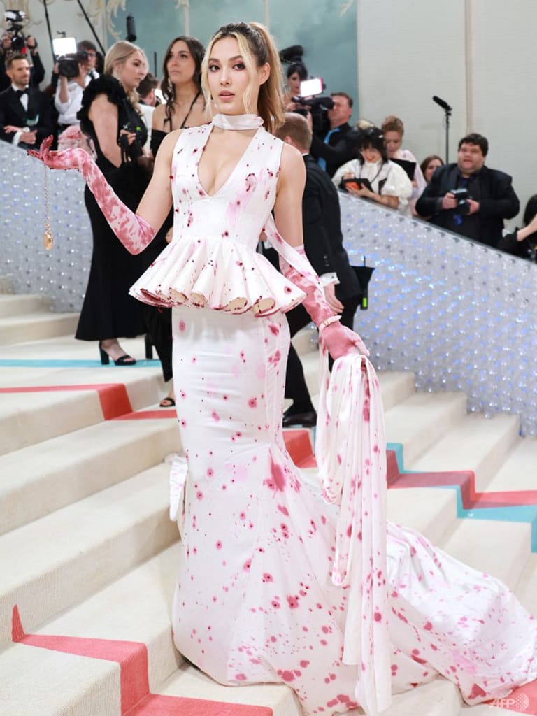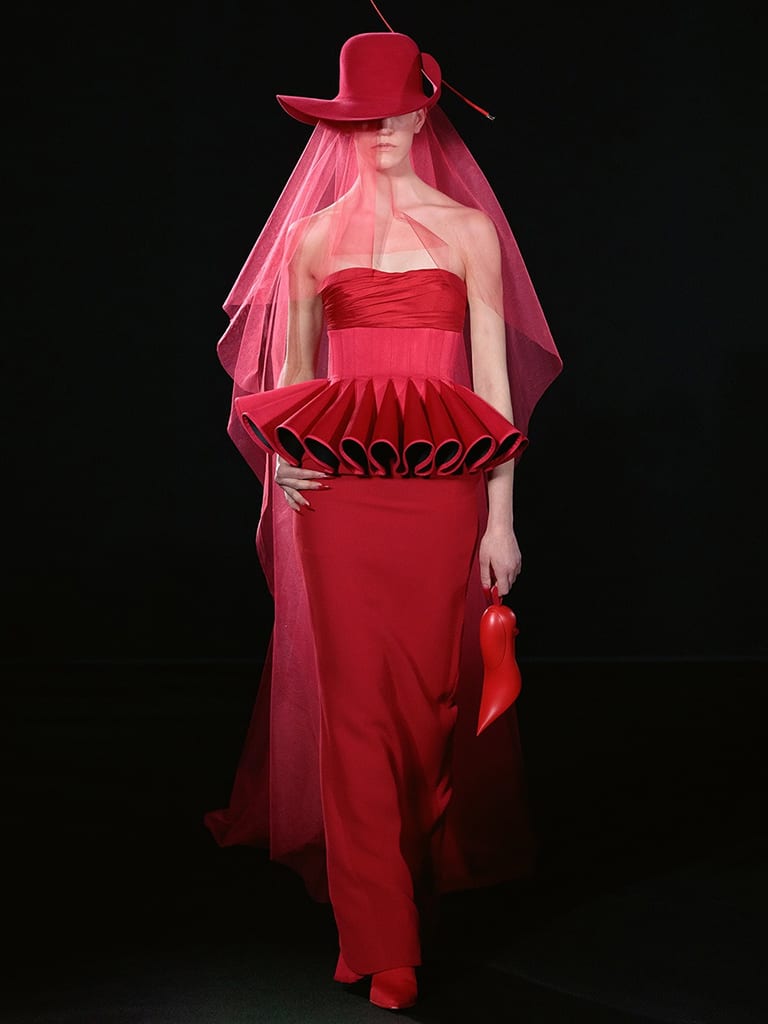 Femininity and female empowerment are central to Wun’s designs, and this is expressed in sculptural ensembles that have a “look-at-me” urgency and a graphic silhouette. As if in contradiction to the stereotype of the Chinese woman as a wilting wallflower, Wu’s creations are made for the new crazy rich dragon ladies who lunch on diamonds and sip on egos. His sculpted, geometric looks, often with aggressive edge in a pleated ruff or a protruding peplum, always has talking point embellishments – painstaking bloodstains, or scorch marks as fine as lace florets. These theatrical looks have dressed several A-listers including Cardi B and Blackpink’s Lisa, Celine Dion, Priyanka Chopra, Lady Gaga and the inevitable Doja Cat.