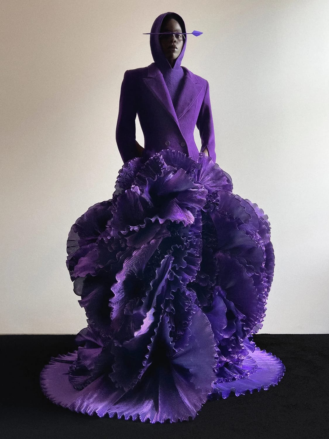 Gupta, inspired by the concepts of Eastern mysticism and in marrying maths abstractions to the ancient spiritual traditions of India, has come up with a wholly original vision of floating whorls and levitating layers. Picture a glittering goddess gown which is a celebration of dark and light, of yin and yang, or a pleated hooded cape that looks like an iridescent cloud.