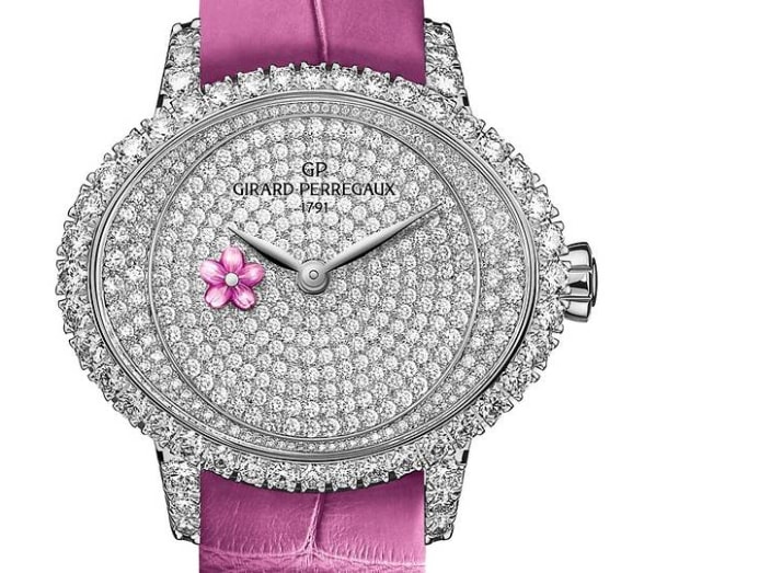 This whimsical piece from Girard-Perregaux is an excellent example of feminine watchmaking. The Cat's Eye collection is the brand's dedicated line for women's watches, and fresh iterations never fail to please. The oval shape of the watch case is contrasted against the round recessed inner dial, which is made of white mother-of-pearl. The outer dial is similarly made of mother-of-pearl, but has been deftly engraved with a tapering ridged pattern.