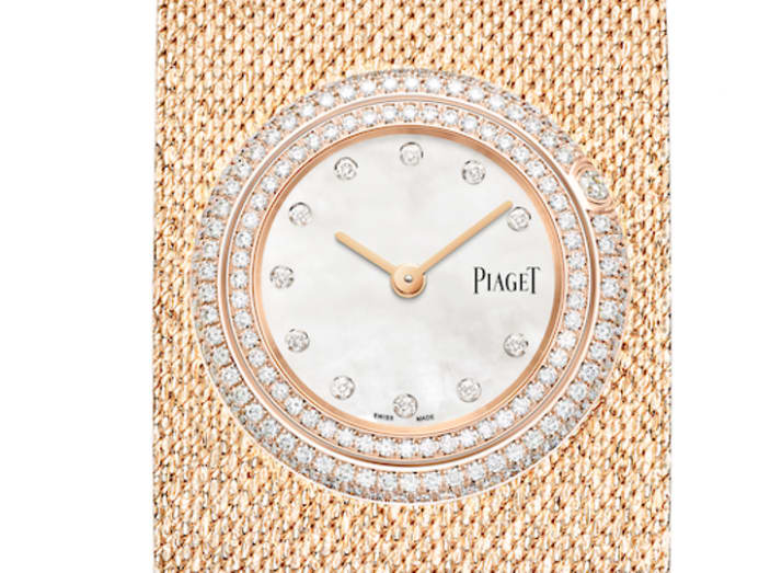 This year's newest iteration features the watch mounted on a new pink gold Milanese mesh bracelet. The bracelet is hand-finished by Piaget's master artisans and given a subtle texture that catches the light as you move your wrist. If that isn't enough glitter, the watch also comes with a gleaming mother-of-pearl dial and 11 diamond indices. The 29mm bezel is also fully paved with a total of 126 brilliant-cut diamonds.
