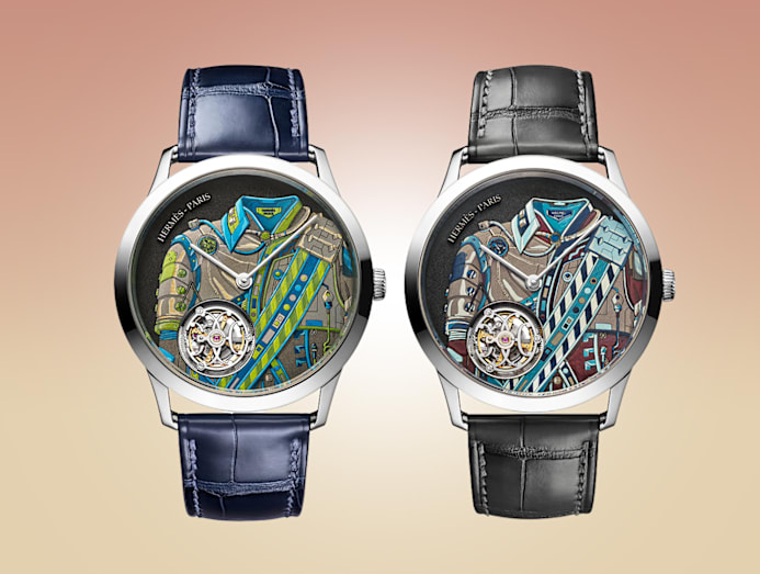 In a first for the Slim d’Hermes line, a tourbillon appears at 7 o’clock, framed by a cage bearing the historic motif seen in the lift of Hermes’ flagship boutique on Faubourg Saint-Honore in Paris. The watch is driven by the ultra-thin, self-winding calibre H1950T with a 48-hour power reserve, visible through a sapphire caseback and paired with an alligator strap crafted in the maison’s workshops.