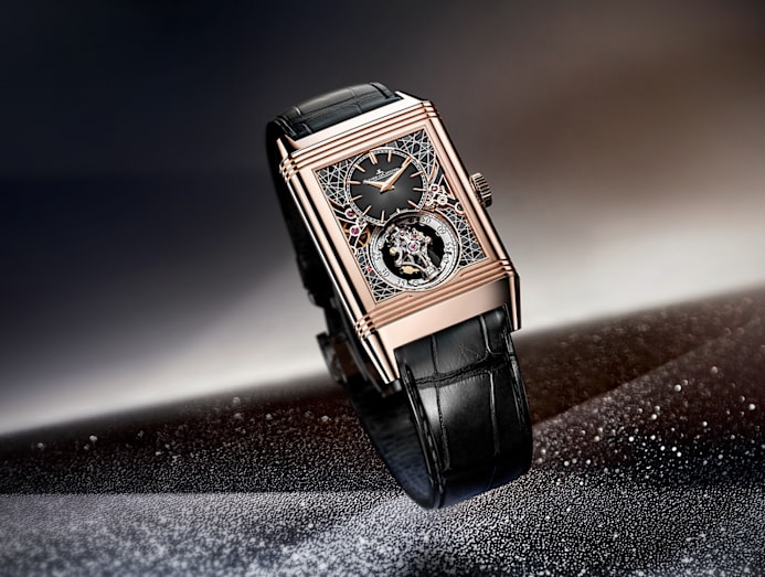Both dials are decorated using an intricate process that blends laser-cut pink-gold plates with 200 hand-lacquered hollows, executed by a single craftsman for each piece. The front features Art Deco-inspired geometric ribs in black and grey lacquer, while the reverse flaunts airy skeletonisation framed by glossy black lacquer. Uniting 382 components in a case just 13.63mm thick, the Reverso Hybris Artistica Calibre 179 is a noble expression of the 180 skills brought together under one roof at Jaeger-LeCoultre.