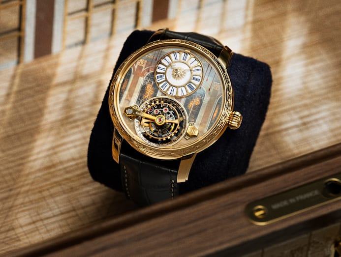 The scene of costumed guests and glittering chandeliers is inspired by an 18th-century etching by Charles-Nicolas Cochin. Marble from the same Sarrancolin quarry used at Versailles, along with Cacholong stone and inlaid oak, echoes the original architecture, while chandeliers and figures are etched into sapphire plates that float above the dial.