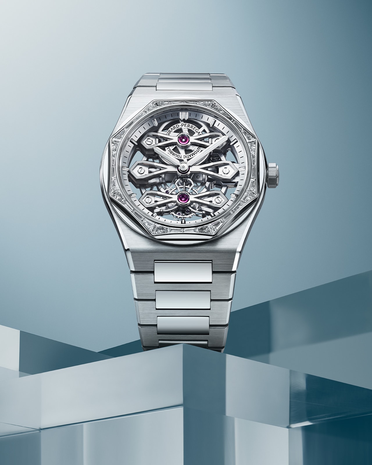 Girard-Perregaux unites two of its greatest icons in the new Laureato Three Gold Bridges, a 50-piece limited edition marking the Laureato’s 50th anniversary. Housed in a 41mm steel case with a white-gold octagonal bezel and integrated bracelet, the watch dispenses with a traditional dial to reveal the new in-house calibre GP9620 – a tourbillon movement built specifically for this model. Three openworked white-gold bridges align the barrel, gear train and tourbillon on a single axis, transforming the movement into a suspended mechanical sculpture.
