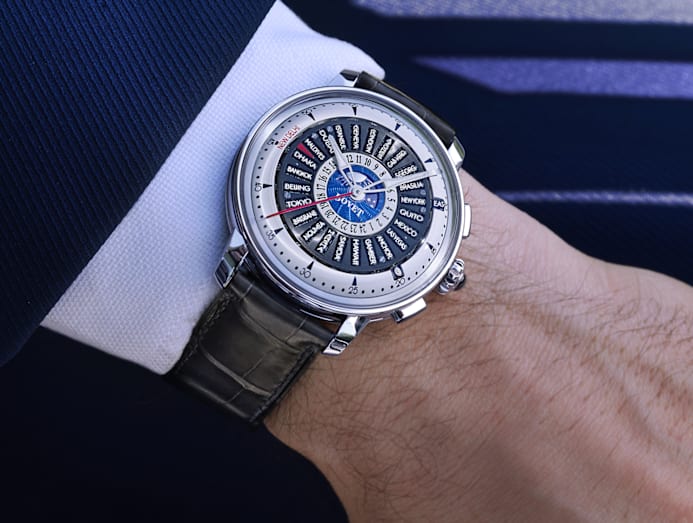 On the dial, the aesthetic is dramatic yet remarkably legible. The rollers form almost the entire circumference, making world time the visual focal point rather than a peripheral complication. At the centre sits a 24-hour disc linked to local time, which also serves as a clear day-night indicator. With a single glance, the wearer can read the local hour, understand where the sun is in their own sky, and see what time it is for colleagues or loved ones across cities from Los Angeles to Tokyo. It’s an interface created for real travellers and global citizens rather than a showcase of mechanical bravado.