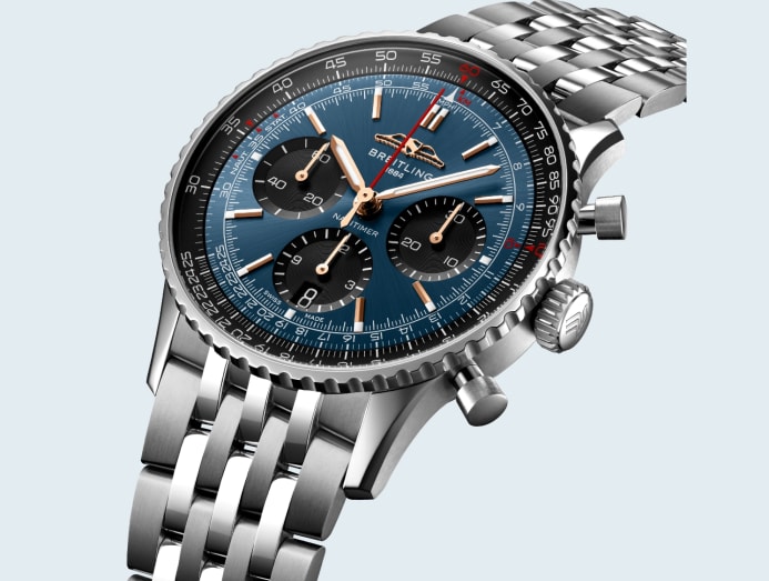 The Navitimer B01 Chronograph 41 sports Singapore Airlines’ distinctive shade of blue, while the Navitimer Automatic 38 features a caseback engraved with the airline’s signature batik motif.