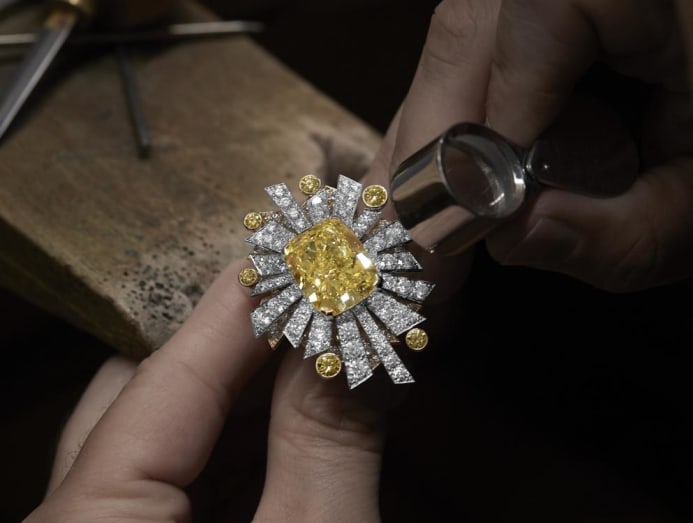 The sun series, on the other hand, charts a totally different course. Referencing Chanel’s rising star sign, Leguereau energised the sun’s palpable power through audaciously graphic lines. The most eye-catching of the 24 sun-related pieces is unquestionably the three-tier Soleil 19 Aout necklace. This transformable piece, pegged at S$6,639,900, features a 22.10 carat cushion-cut yellow diamond brooch that can either be worn on the necklace, on the ring or on its own as a brooch.