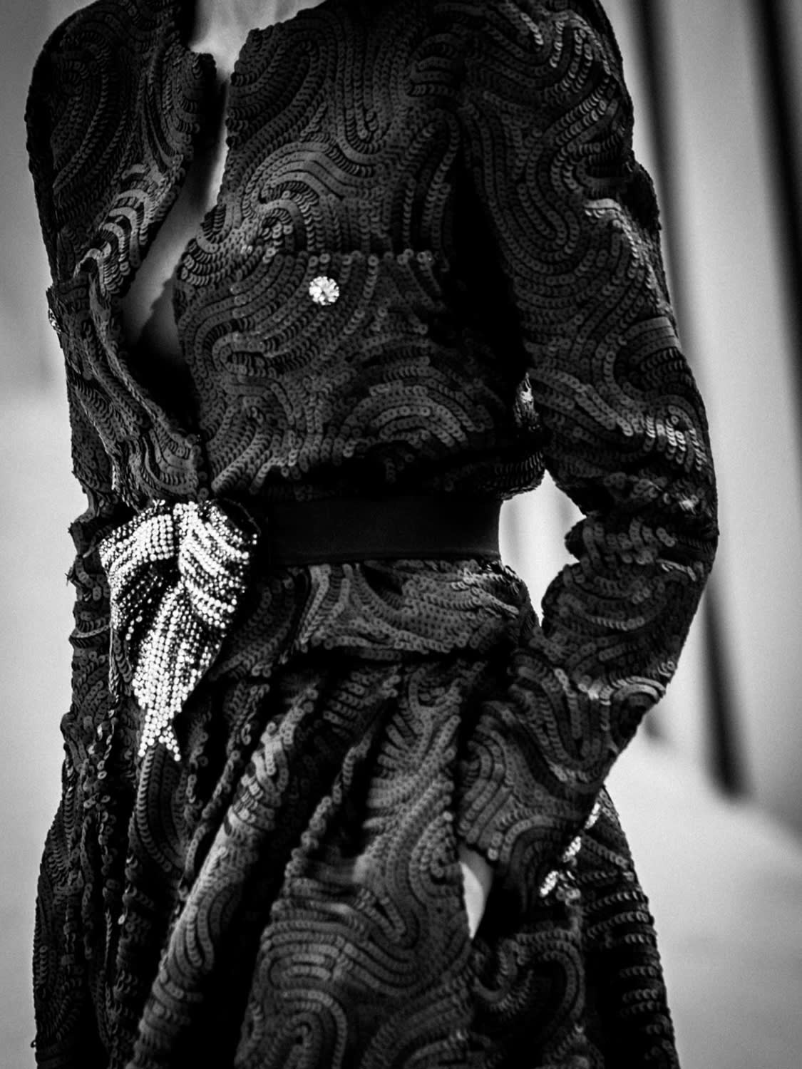 Suits also have a special place at the house of Chanel. “Mademoiselle Chanel used to borrow ideas from menswear, today there are still similar references. For example, this suit”, Christine gestured towards a black velvet suit. “It could be a men's suit, but it's very feminine and it's open in the back as well. This idea of contrast allows the wearer to have some men's elements from menswear, but still look very feminine.”