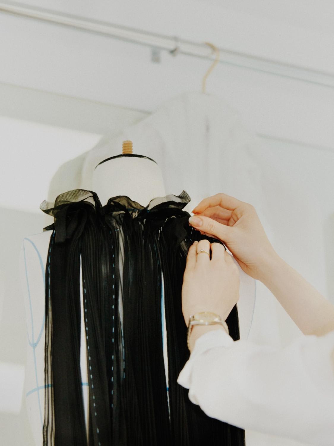 “After receiving the sketches (from Viard), we make the pattern on the mannequin,” explained Olivia. “The first fitting is made in toile (calico cotton). After that, we choose the fabric – the choice of fabric is vital, we try to work with silk, organza or tulle to create a sense of lightness. Then we find buttons to match – it is always jewellery buttons for haute couture, never buttons with logos. And finally, we fit the garment on the model or the client and make the final adjustments.”