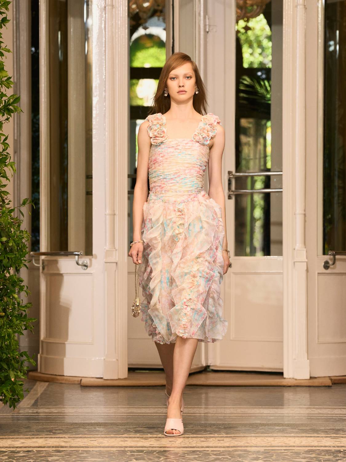 Other highlights included a black skirt suit glinting with beaded braiding; a flared dress adorned with chiffon flower stripes; and a crisp white ensemble featuring cropped trousers and a Spencer jacket — delivering a modern twist on garden-inspired elegance.