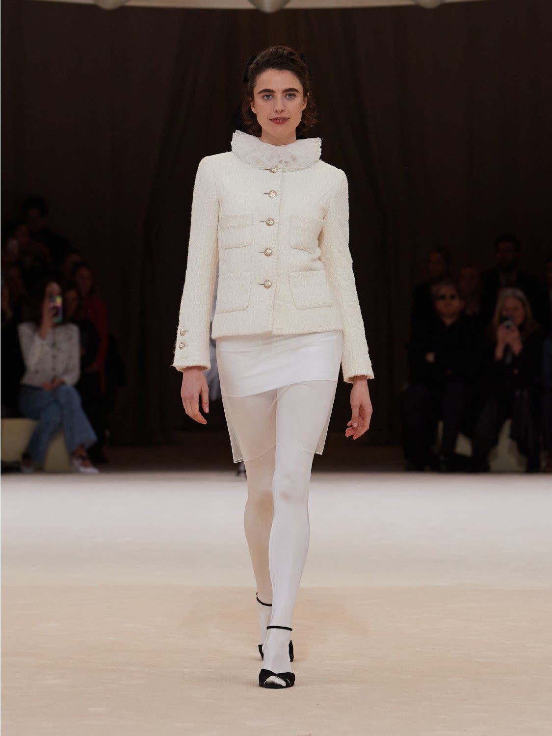 CHANEL’S CINEMATIC ODEIn a dazzling prelude, a fashion film starring Margaret Qualley, the actress and daughter of Andie MacDowell, illuminated the runway's curtained walls with a whimsical narrative directed by Dave Free. The plot, at times reminiscent of Barbra Streisand’s iconic turn in Funny Girl, recounts a tale of a beautiful young woman on a quest for a missing button — a journey that leads her to the heart of Paris.