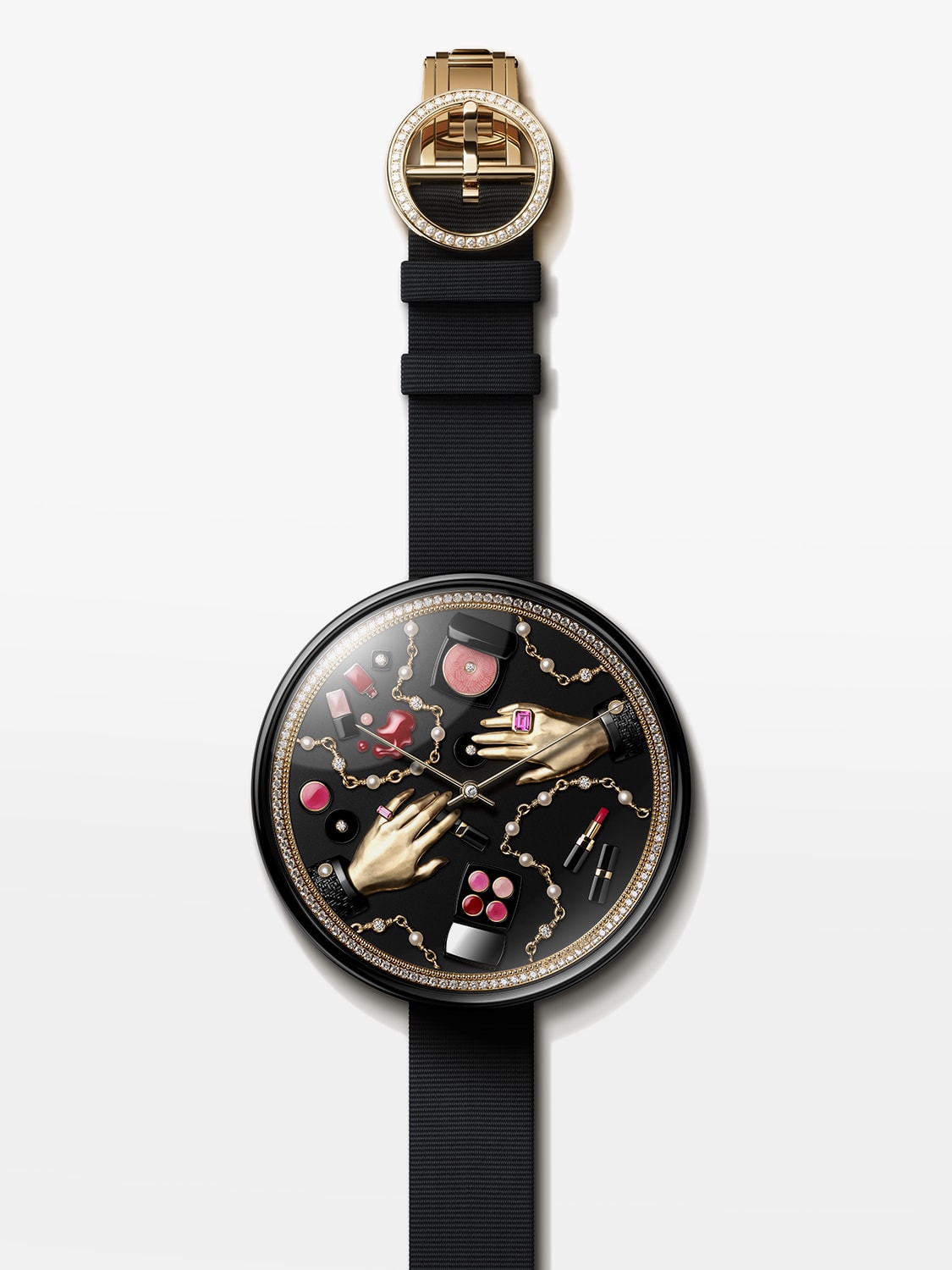 The Premiere Charms Blush comes with blush-toned charms that spell out "Chanel." Meanwhile, the Mademoiselle Prive Pincushion Beauty Art is a true work of art, depicting Gabrielle Chanel’s hands alongside her makeup essentials, intertwined with a miniature necklace set with diamonds and pearls. The dial itself is a dazzling display, set with 120 diamonds and 234 yellow gold pearls.
