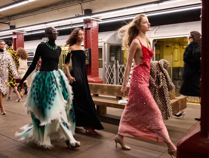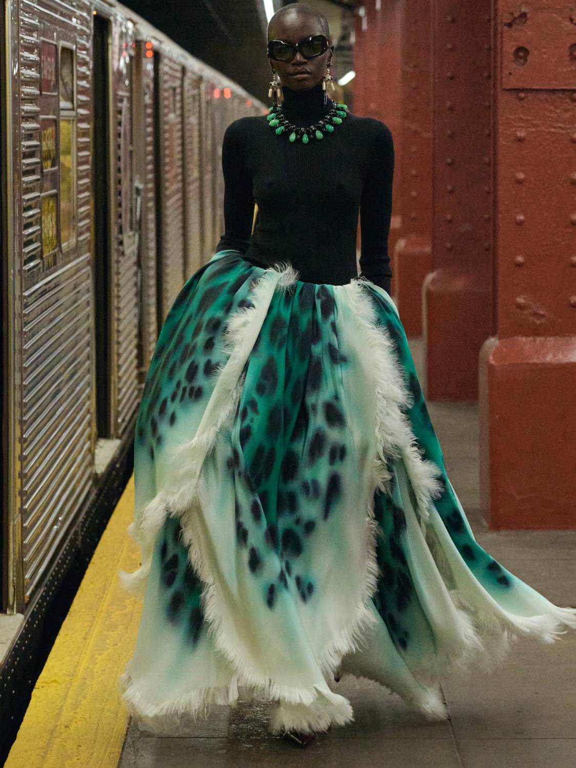 But down a flight of stairs was the real platform. Guests settled into bleacher seats resembling subway benches. “Stand clear of the closing doors!” came the announcement on the soundtrack, familiar to New Yorkers. Then a train came rolling in, and out of the cars came the models.