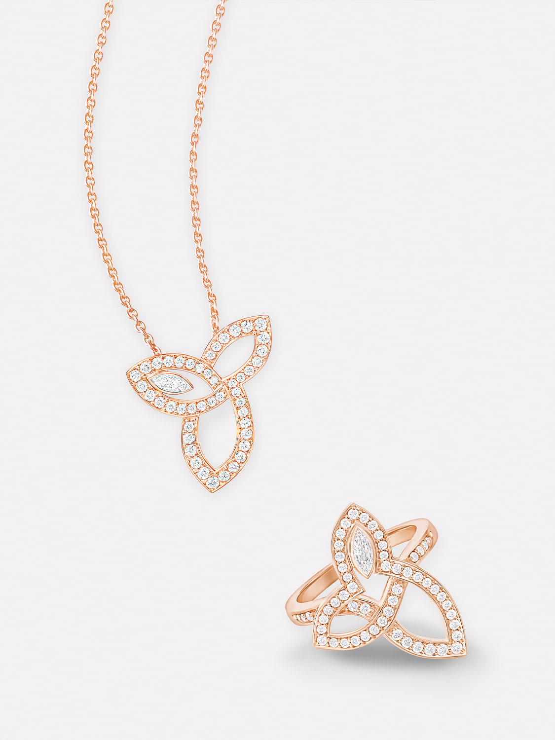 With Harry Winston’s Lily Cluster collection, intricate interlacing diamonds capture the graceful movement of lilies in bloom. Round and marquise-shaped diamonds are paired together, forming a bouquet of sparkles that is great for elegant and formal wear.