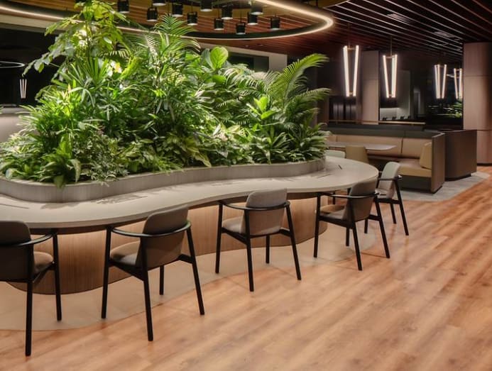 The staff areas are equally inspiring, eschewing staid back-of-house office design. For instance, the sixth storey office for Citigold bankers is anchored with a verdant central planter as a “tropical island statement”. Hot desks and seating booths curve around it.