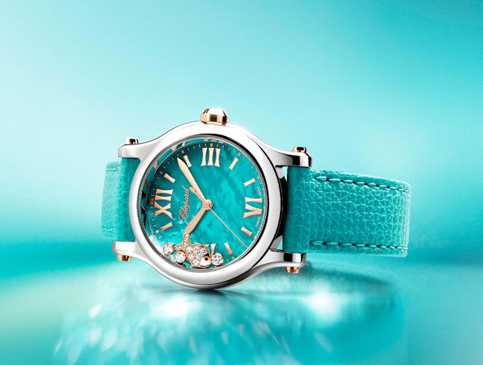 Chopard’s happy little collection of wrist aquariums welcomes its latest edition in vibrant turquoise. This colourway has appeared before in bi-metallic rose gold and steel, but is now presented in a 36mm Lucent Steel steel case with ethical rose gold-toned accents, and a simple textured mother-of-pearl dial that mimics the gentle ripples of tropical waters. Dancing freely around the dial are three diamonds and a tiny fish in ethical rose gold, set with diamonds and an onyx for its eye.