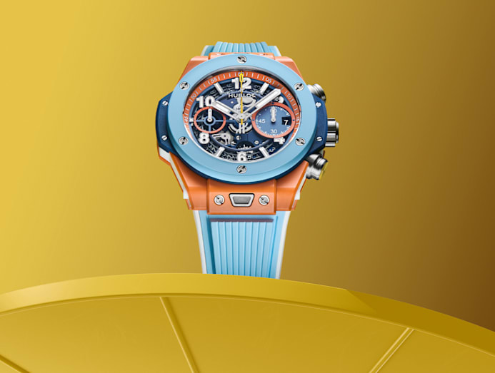 This year’s summer editions bring Hublot fans to Mykonos — specifically its golden hour and crystalline seas, thanks to a vibrantly hued ceramic case and dial accents. At 42mm it’s a fairly beefy watch, made even more assertive with the HUB1280’s chronograph. Complementing the bright colours are the mainplate, bridges, rotor, and case flanks in dark blue. Three interchangeable straps are included with each watch — in sky blue, dark blue, or orange and all lined with white rubber — so you’re covered whether the mood calls for sky, sea, or sunset.