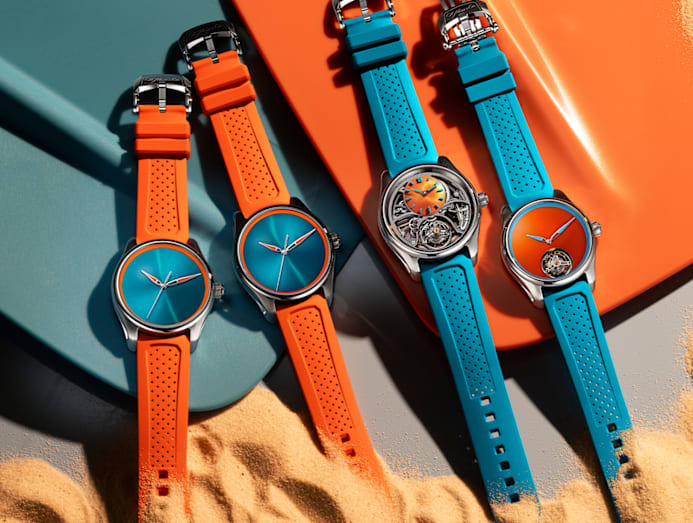 After the riotous fun it had with stone dials in its recent Endeavour Pop series, H. Moser is clearly still in a holiday mood. Three models — the Pioneer Centre Seconds, Pioneer Tourbillon, and Pioneer Cylindrical Tourbillon Skeleton — have gotten heady beach makeovers with fiery orange and rich turquoise dials and accents. Cased in steel and paired with rubber straps, the trio exudes all the energy of beach barbecues and sundowner cocktails.
