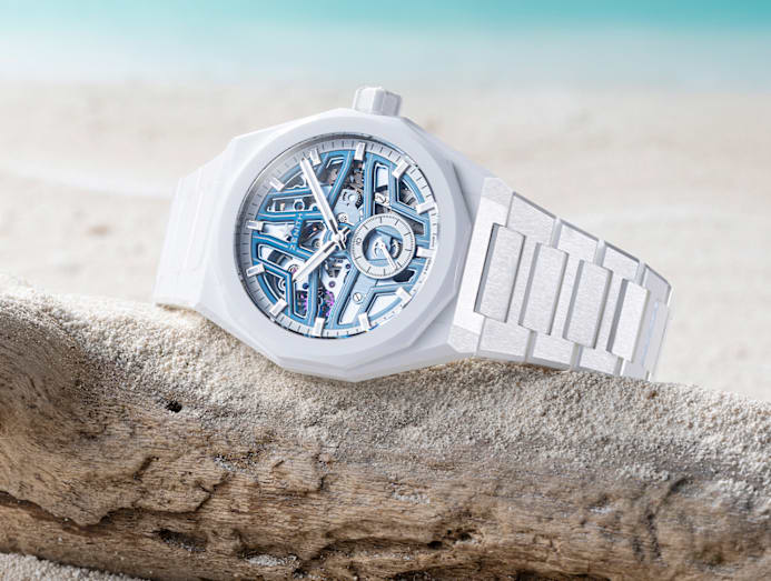 After two titanium limited editions made in partnership with Australian online watch media Time+Tide, the third and final collaboration in the “Surfer” series comes in crisp, brushed white ceramic. Just like its 2023 predecessor, this 100-piece edition borrows the Defy Skyline Skeleton model and dresses it up with a gradient dial, as the bridges shift from deep ocean blue at the top to pale sky blue at the bottom. Peer closely and you’ll spot the high-frequency El Primero 3620 SK calibre beneath the star-shaped architecture.