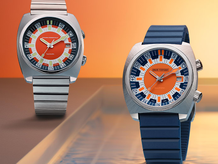 Think Girard-Perregaux and you probably picture tourbillons, lots of bridges, and Aston Martins — not cheerful dive watches. But they did make them back in 1969, where for a handful of years the original Ref. 9108 drew attention thanks to its retro-futurist dial and cushion-shaped case. Now, with the help of Bamford Watch Department, it’s back, sunnier than ever, with an updated 40.3mm × 38mm brushed titanium case and the in-house GP03300 calibre visible through its solid case back. Limited to 350 pieces.