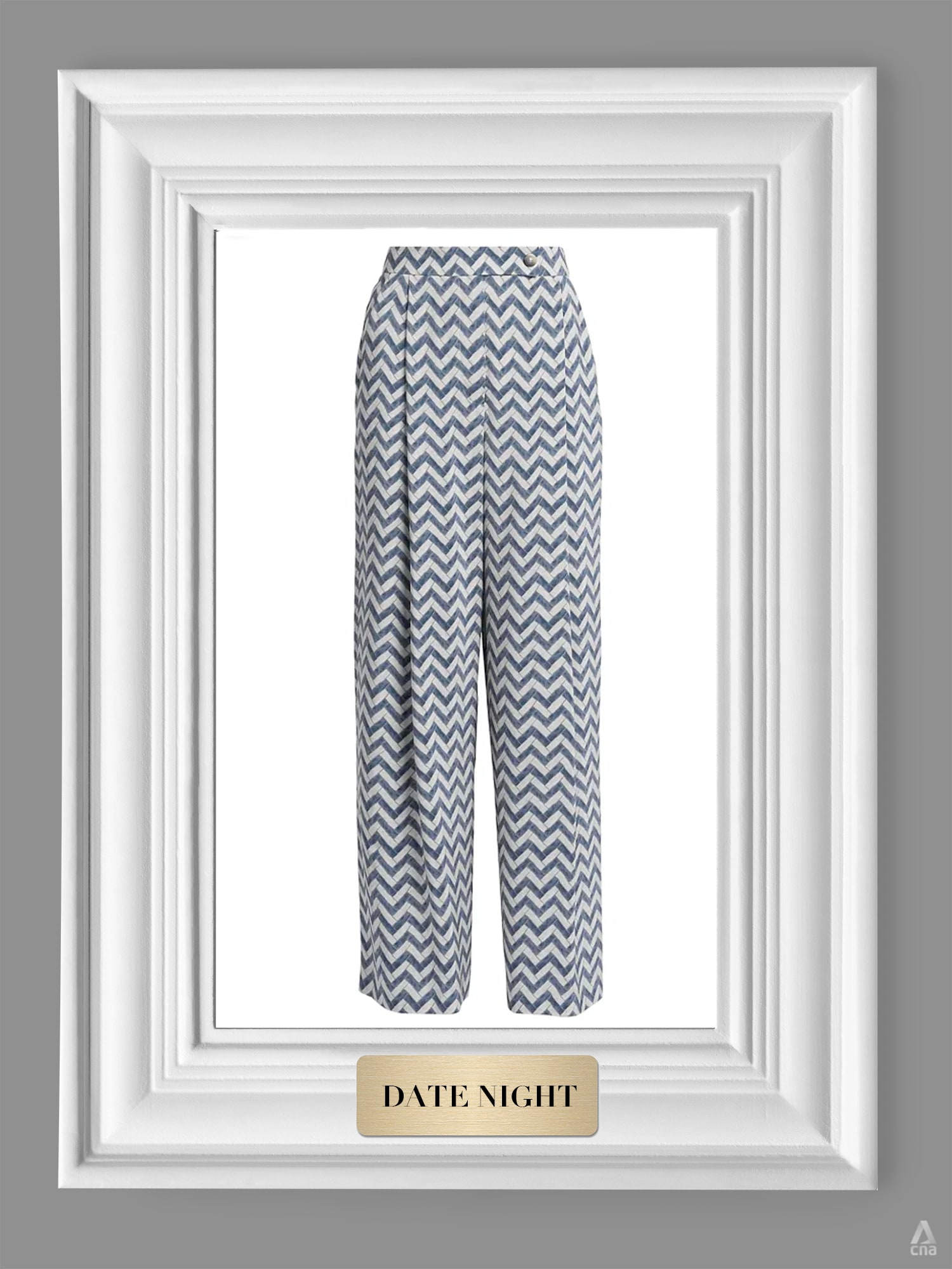 For something more muted but no less stylish, you can opt for this pair of chevron printed silk trousers from Giorgio Armani, which features a high waist and two side slash pockets. Its blue-grey colourway is at once fresh yet versatile, making it easily compatible.