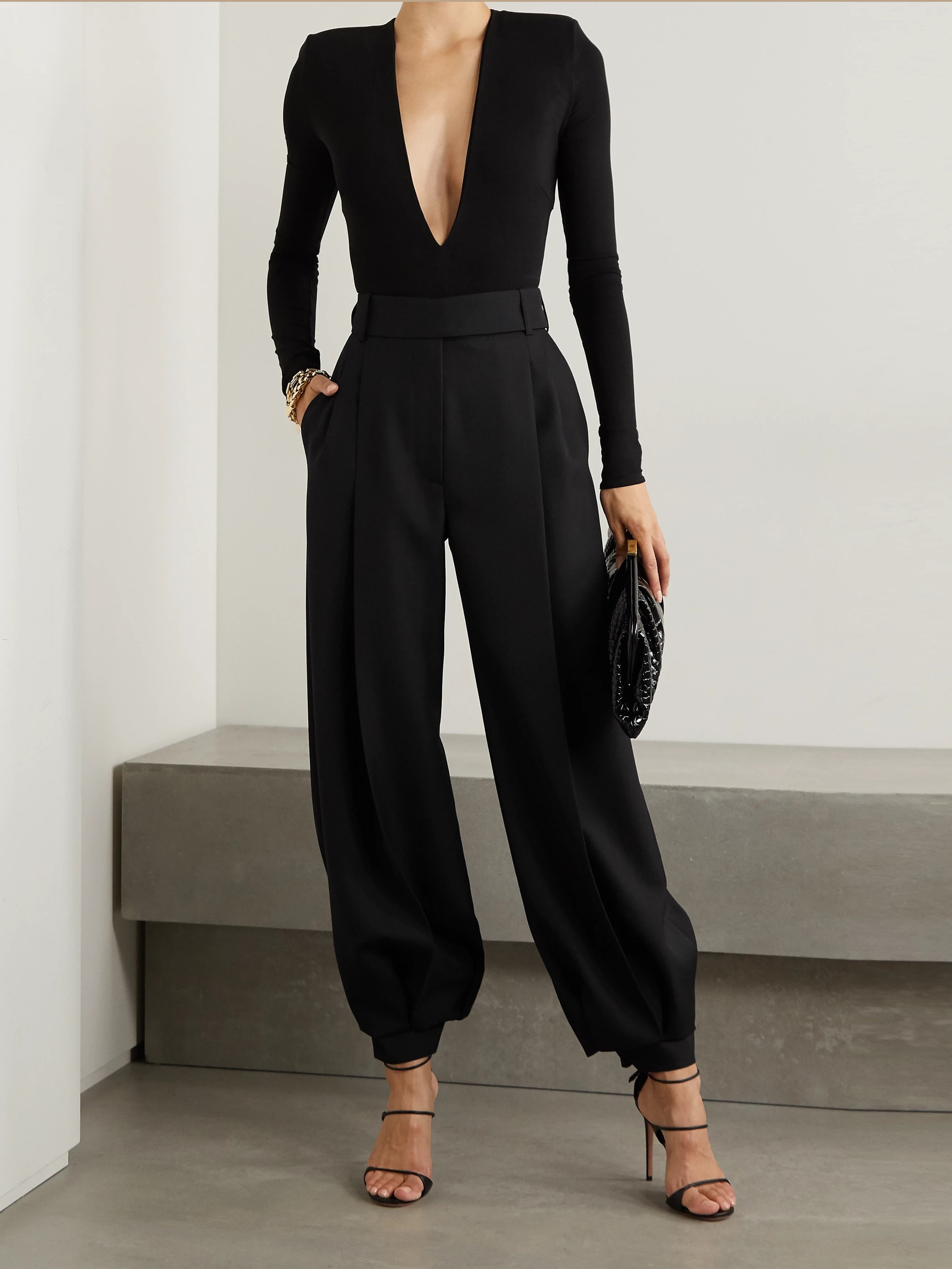 For a softer harem-style silhouette, this pair from Alexandre Vauthier with its high-rise waist and tapered cuffs fits the bill. Pair it with a silky blouse or take it up a notch with a sharply cut blazer. You also cannot go wrong with this pleated pair of pants made of stretch-wool from Altuzarra, which is designed with a flattering high-rise waist and sharp pleats that enhance the dramatically wide legs.
