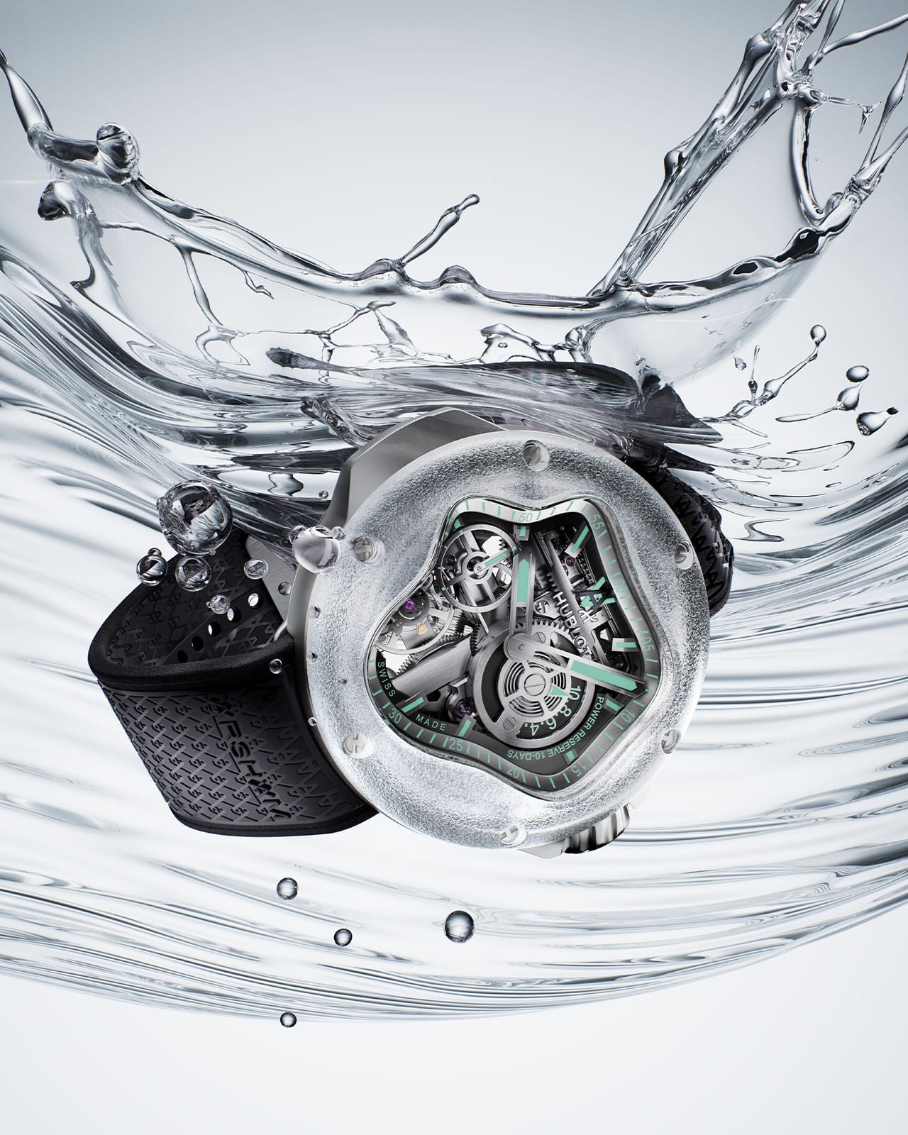 The 42mm microblasted titanium case integrates a frosted sapphire crystal bezel, rubber and titanium elements to create a sculptural silhouette that appears to ripple outward from the dial. A dramatic, asymmetrical splash-shaped aperture reveals Hublot’s new, compact MECA-10 manual-winding movement, which boasts an impressive 10 days of autonomy and is visible via the watch’s sapphire front and caseback. Accents in Arsham’s signature green animate the hour and minute hands, numerals, hour and five-minute markers, small seconds hand at 9 o’clock and power reserve indicator at 3 o’clock.