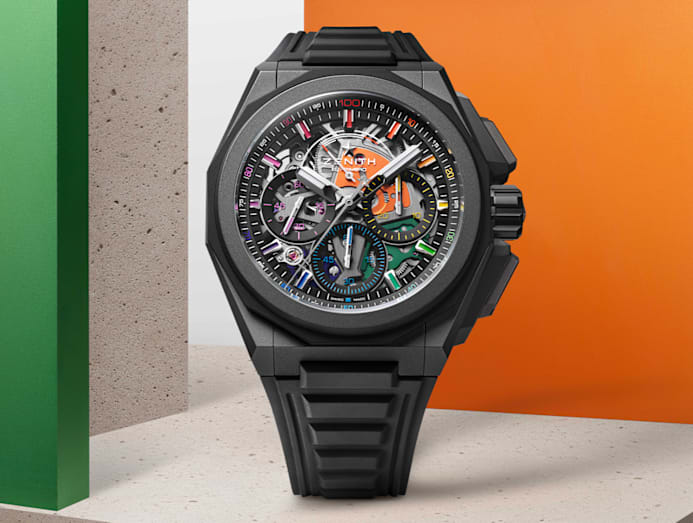 Technically, the Defy Extreme Chroma is as fierce as it is colourful. It’s movement, the El Primero 9004, houses two independent escapements, each with its own barrel and regulator. One beats at 5Hz for timekeeping and another at an astonishing 50Hz to power the chronograph.This allow the central seconds hand to move around the dial once per second for 1/100th-of-a-second precision. Each watch comes with two interchangeable straps in rubber and Velcro, as well as a titanium bracelet.