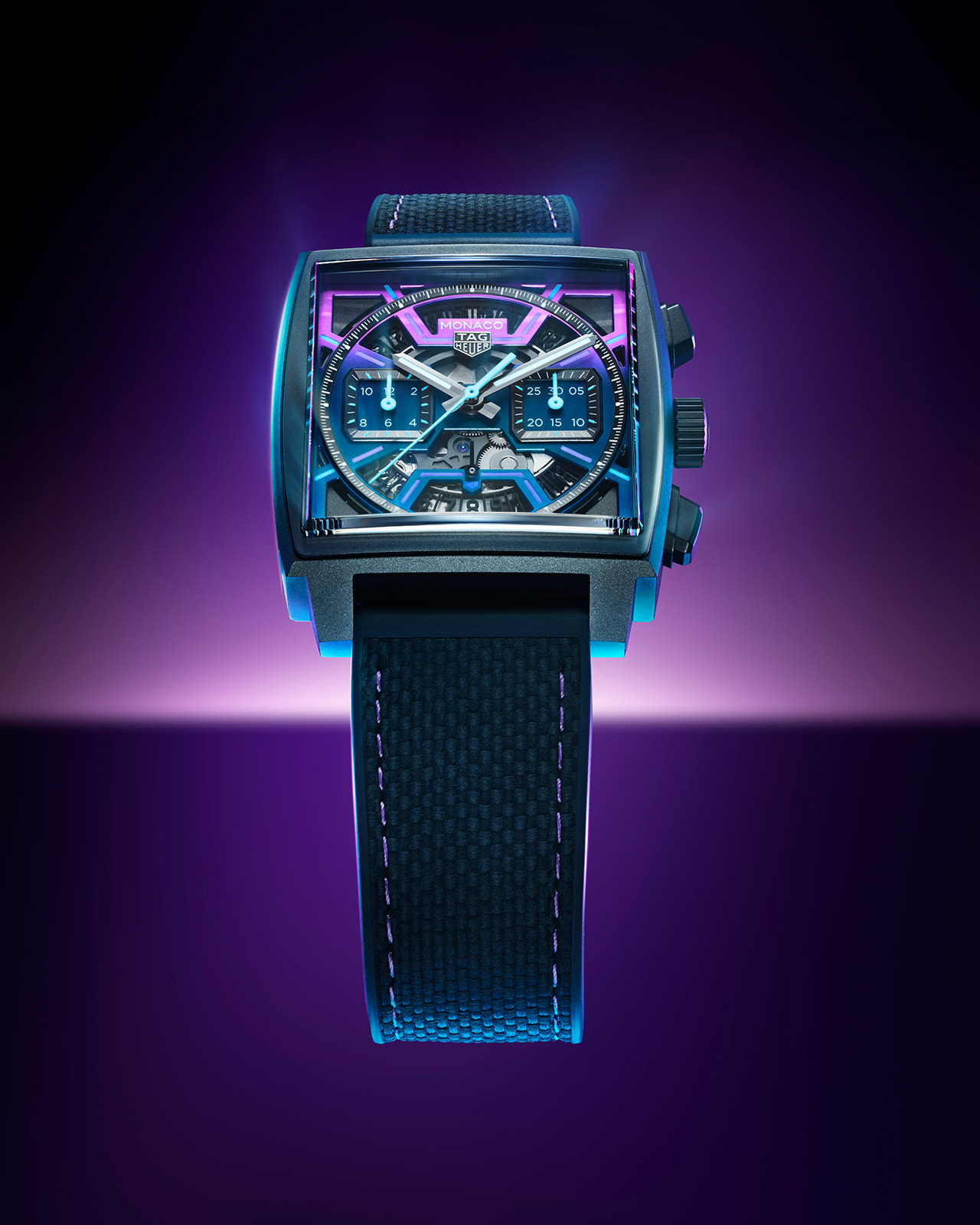 Tag Heuer channels the electrifying atmosphere of the Formula 1 night circuit into the latest Monaco Chronograph, a limited edition that reimagines the brand’s most iconic square-cased watch for after-dark adrenaline. Featuring a 39mm black DLC-coated titanium case, the timepiece is lightweight yet striking, its skeletonised dial transitioning through a vivid gradient of violet to deep blue – an homage to the moment twilight slips into night.