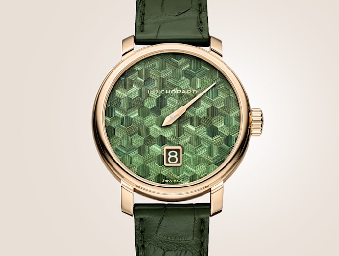 A jump-hour aperture at 6 o’clock preserves the clarity of the design, while the minute hand sweeps above the marquetry uninterrupted. The 40mm ethical rose gold creation houses a movement finished to Poincon de Geneve standards, visible through an exhibition caseback. Paired with a hand-sewn green alligator strap, this piece pays a tribute to Chopard’s commitment to preserving metiers d’art, while advancing fine horology.