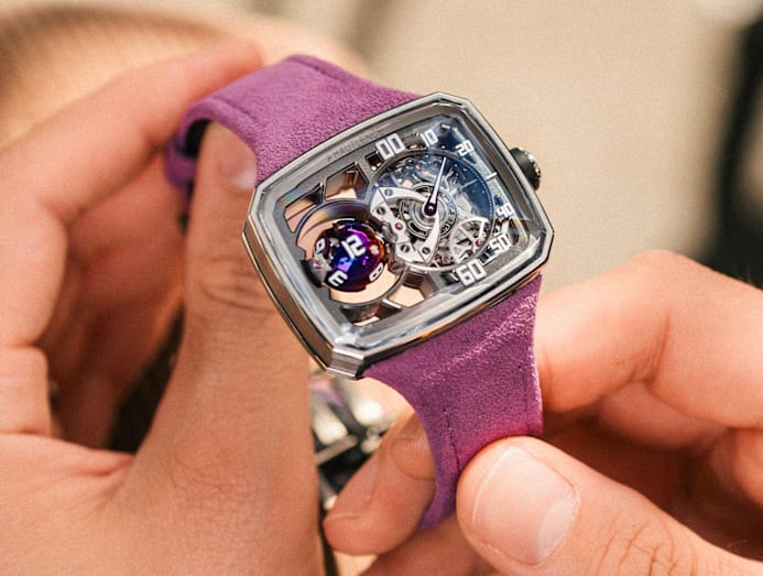 On the left of the skeletonised dial is the rotating hour sphere that’s the star of the show. The polished, purple-coated titanium orb turns on three axes and is driven by four conical gears set at 21 degrees, creating the illusion of a floating, shape-shifting sculpture.