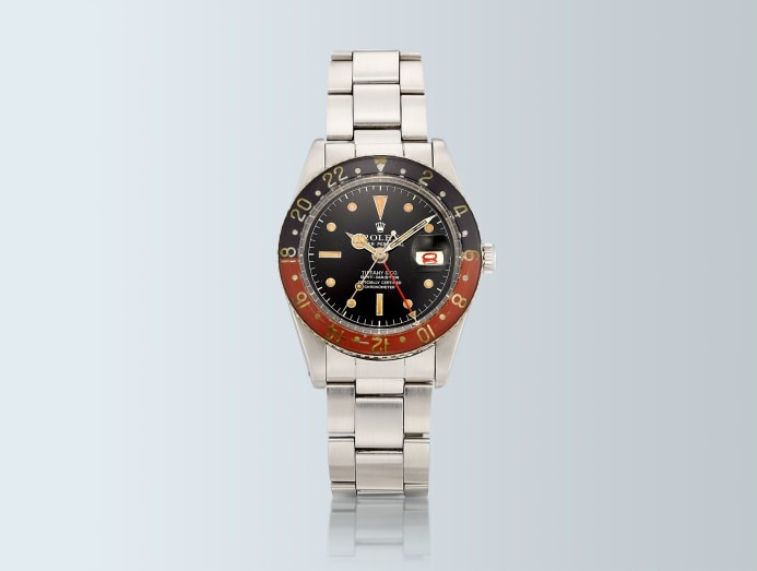 The Ref 6542 was first developed in 1954 for Pan-Am Airline pilots. Its bi-coloured bezel helped pilots easily distinguish between day and night for home time. Early examples – like the one Fujiwara has – had bakelite bezels filled with radium for lume. Quickly realising that bakelite was brittle and radium was radioactive, Rolex recalled all its bakelite GMT-Masters and replaced the material with aluminium starting in 1956. This stainless steel model has clearly seen some wear and tear, but its Tiffany & Co logo and bakelite bezel justifies its high estimate of US$103,000 to US$205,000.