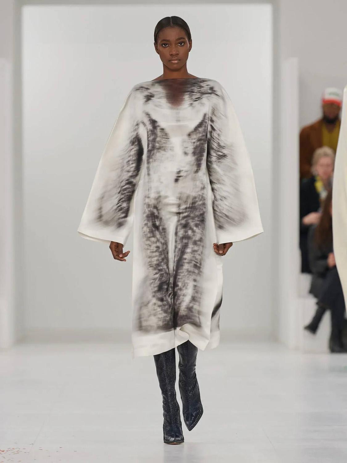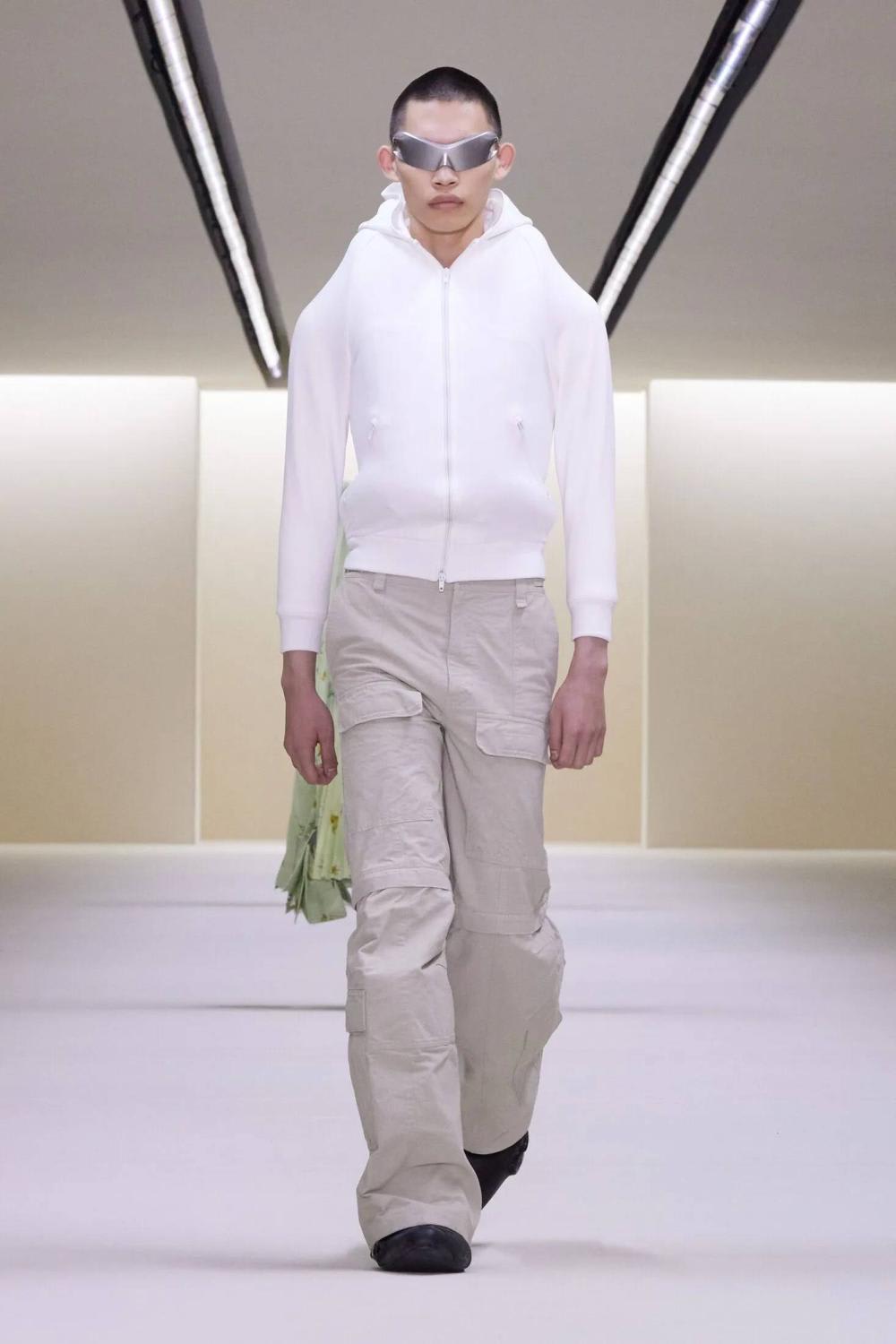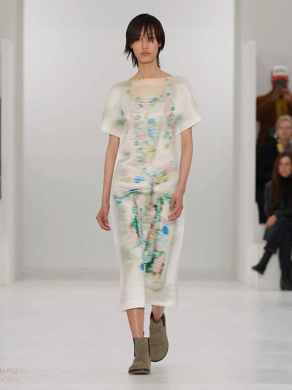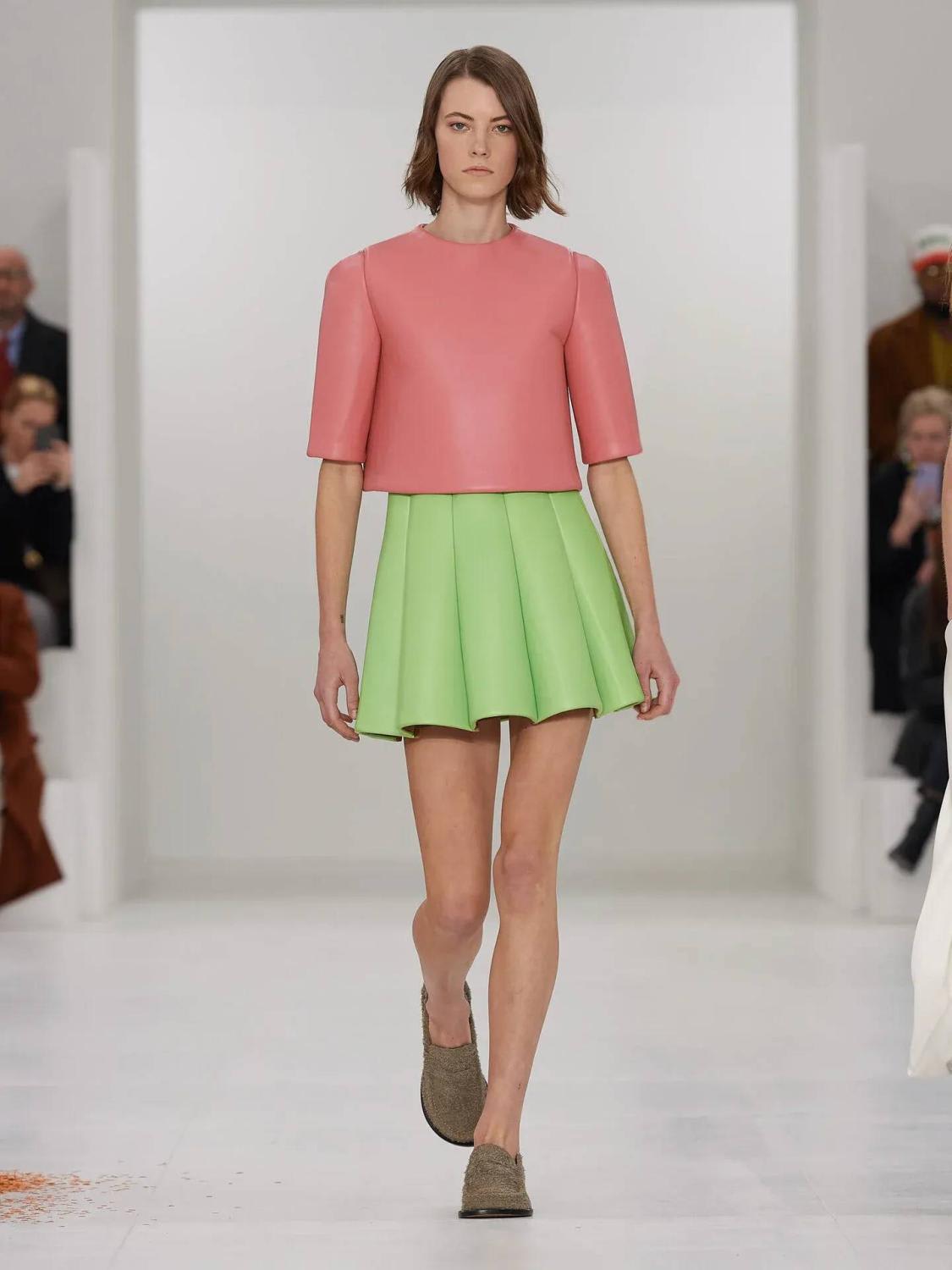 Loewe is obviously an exercise in re-seeing all the fashion archetypes in the clear light of the digital generation. We see a dress, as if for the very first time, quite purely as an outline in white, framing a ghost of a floral dress inside. We see a typical men’s grey cardigan, enlarged. A plain white T-shirt is made entirely of goose feathers, and so a pair of board shorts. A leather coat, a tunic, a pleated skirt – all platonic versions of its type, it’s the thing by definition – entirely stripped off adornment. We recognise these classic fashion items as what it is for the first time in decades – it’s like creative director Jonathan Anderson had reached into the past and removed all the fashion gunk that had cloyed on these garments through the seasons and gave it all a good wash. It’s a clean slate collection, starting from zero.