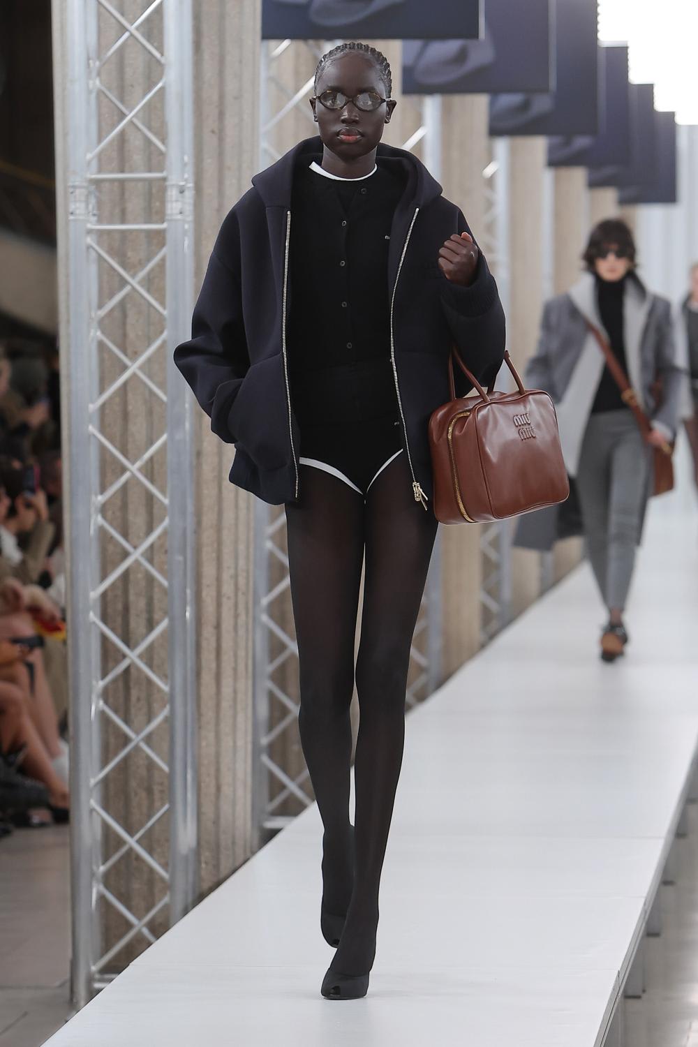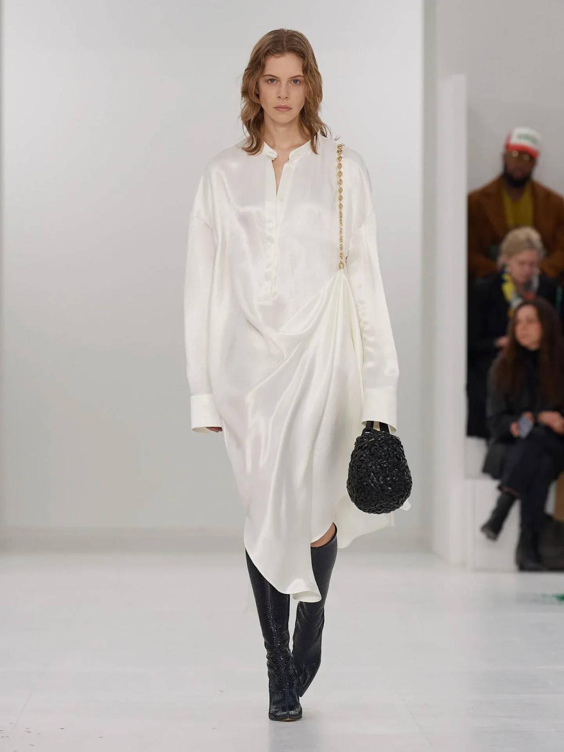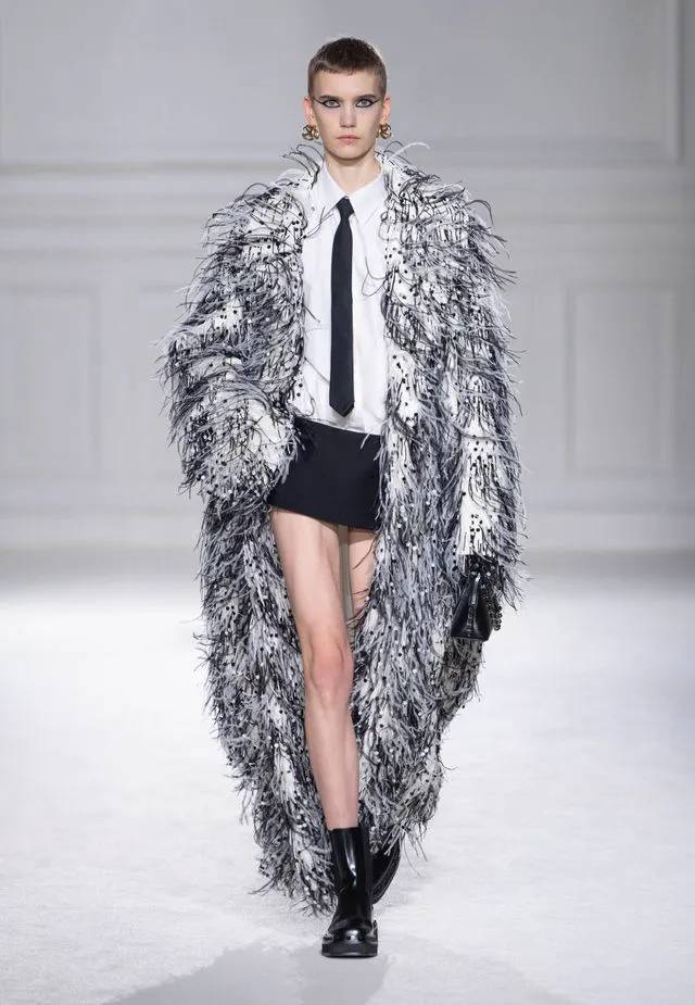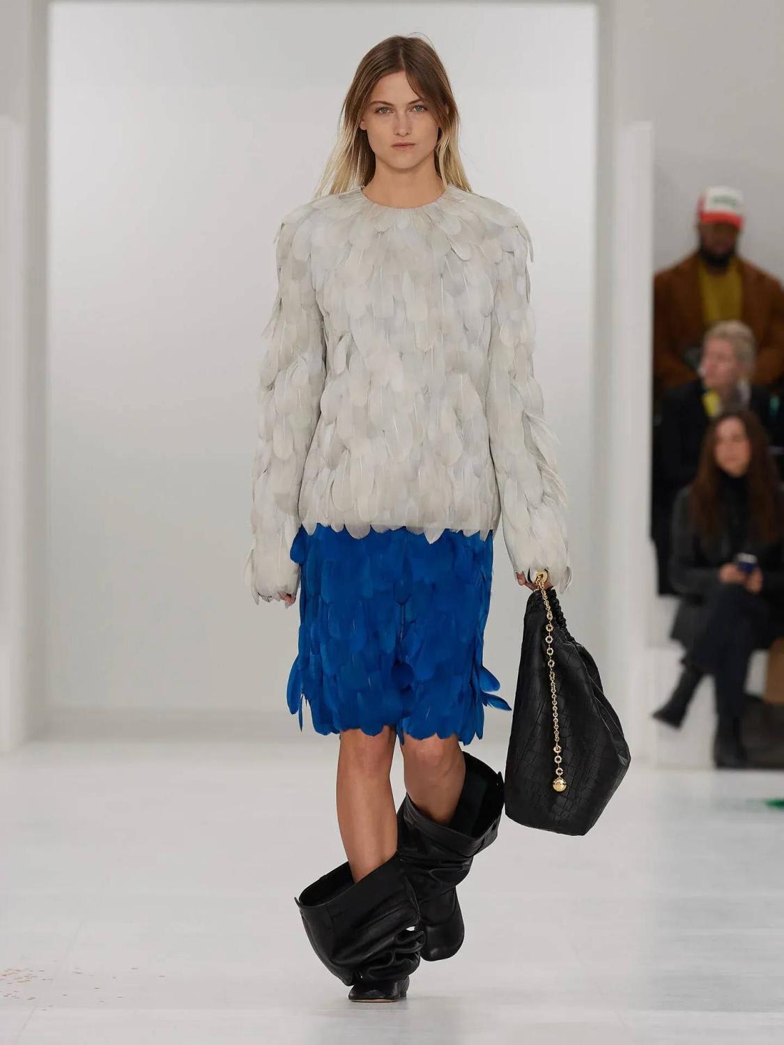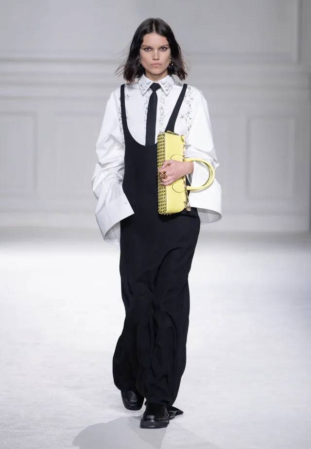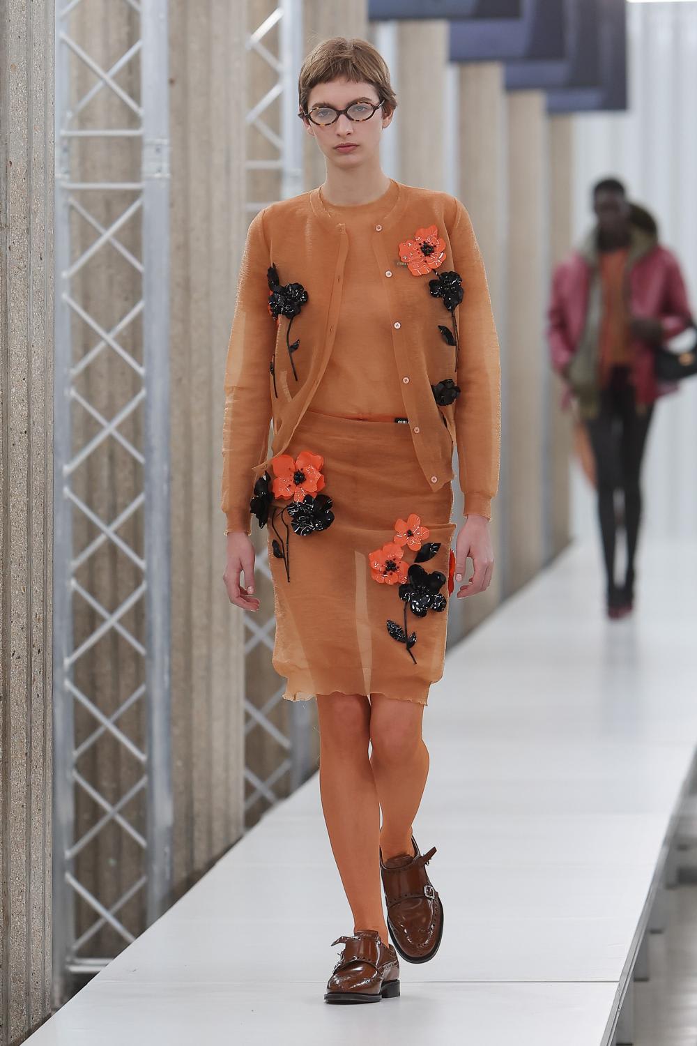 Loewe is obviously an exercise in re-seeing all the fashion archetypes in the clear light of the digital generation. We see a dress, as if for the very first time, quite purely as an outline in white, framing a ghost of a floral dress inside. We see a typical men’s grey cardigan, enlarged. A plain white T-shirt is made entirely of goose feathers, and so a pair of board shorts. A leather coat, a tunic, a pleated skirt – all platonic versions of its type, it’s the thing by definition – entirely stripped off adornment. We recognise these classic fashion items as what it is for the first time in decades – it’s like creative director Jonathan Anderson had reached into the past and removed all the fashion gunk that had cloyed on these garments through the seasons and gave it all a good wash. It’s a clean slate collection, starting from zero.