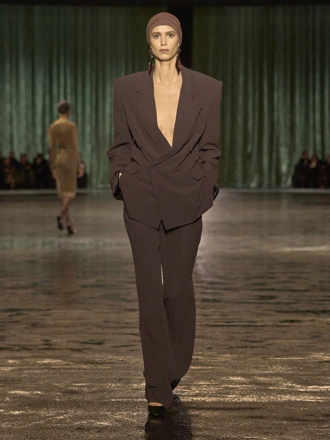 The appeal of masculine tailoring will never go away in fashion, because this style will always symbolically empower, challenge norms, and provide women with a sense of individuality that conventional feminine clothes don’t. Influential figures in fashion, such as Coco Chanel and more recently, actress Tilda Swinton, have blurred gender lines in their wardrobes, inspiring women to embrace a more androgynous aesthetic. Tailoring can convey a sense of sophistication and elegance, with its clean lines and structured silhouettes often associated with menswear’s origins in utility, military and sportswear, which is appealingly minimalist in times of excess. This season, Anthony Vaccarello at Saint Laurent continues to update the house’s legendary suits made famous by Catherine Denueve in the 1970s.